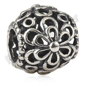 One Quality Genuine Solid Sterling Antique Silver Daisy Flower Charm - to fit Pandora, Chamilia, Biagi and similar 3mm European Bracelets Hallmarked 925. Bead Size:9.6x10.4mm - Hole Size 4.5mm - Weight 1.50 grams
